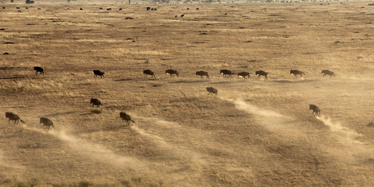 Wildebeest have a short memory bank: So you see that they look at us, run a little bit, forget about us, look around, then run again.