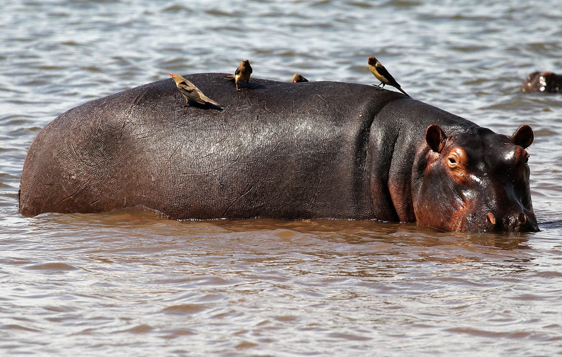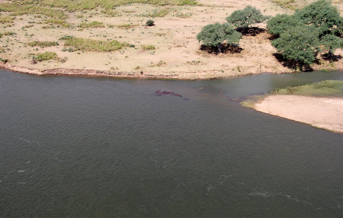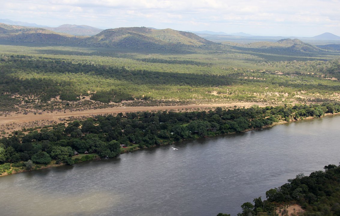 Eine Stunde Flug über einsames, flaches, straßenloses bewaldetes Gebiet, dann glänzt in der Ferne der viertgrößte Strom Afrikas, der Sambesi. Wir werden ihn die nächsten Stunden flussaufwärts begleiten. Selten sind Dörfer und kleine Fischboote zu sehen, dafür umso öfter Hippos, Elefanten und Krokodile. An den seichteren Stellen lassen sich die Flusspferde in großen Gruppen nieder.