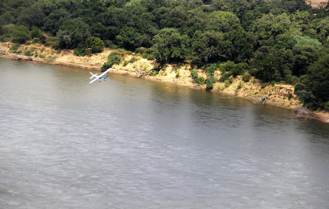 Unsere Reise über den Fluss geht weiter entlang den zerklüfteten Ufern des Stausees Richtung Westen. Nur selten gibt es flache Uferstellen mit Dörfern. Das Wetter ist uns auf diesem Abschnitt nicht hold, die tiefhängenden Wolken lichten sich erst lange nach dem westlichen Ende des Sees. Wir fliegen zwischen Sambia und Simbabwe. Der Fluss ist schmäler geworden und ufert nicht mehr so weit aus. Etliche exklusive Lodges liegen hier an seinen Ufern. Erst beim Zusammenfluss mit dem Kafue weitet sich der Sambesi noch einmal bevor er sich wieder durch ein enges Tal Richtung Süden und nach Kariba zwängt. Wir begleiten ihn durch das mäandernde Tal bis zur Staumauer des Lake Kariba und erhalten eine Überfluggenehmigung von Kariba Control.