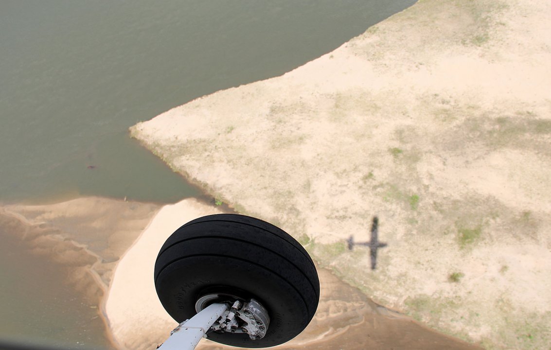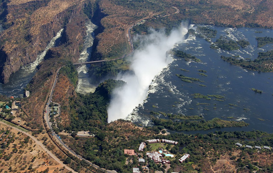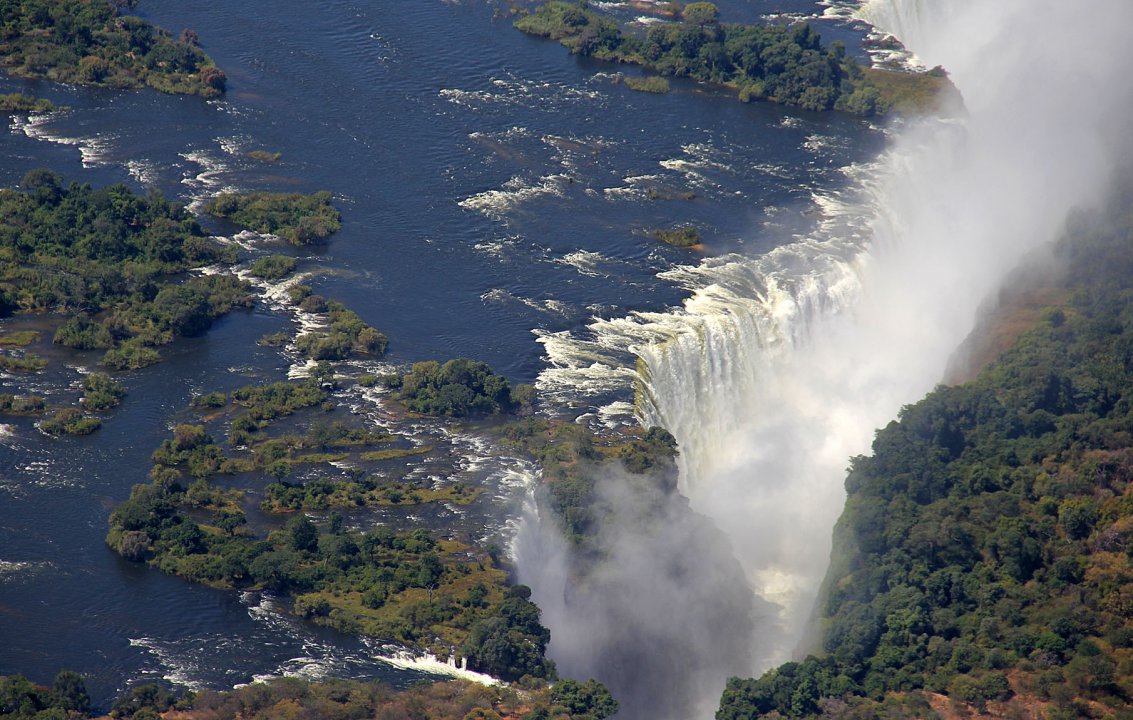 Unsere nächste Etappe führt entlang des Südufers des 280 km langen Lake Kariba zu den Victoria Falls. Am Victoria Falls International Airport reisen wir aus Simbabwe wieder aus und erbitten beim Abflug die Erlaubnis die Victoria Falls zu überfliegen. Der Sambesi stürzt sich hier auf einer Breite von 1700 m in eine 110 m tiefe schmale Schlucht und erzeugt einen bis auf 300 m aufsteigen Sprühnebel. Wir ziehen mehrere Kreise über den mächtigen Wasserfällen und drehen dann Richtung Westen ab. Noch 20 Minuten folgen wir dem Fluss entlang der Grenze zwischen Sambia und Simbabwe bis nach Kasane, wo sich der Chobe mit dem Sambesi vereint. Hier verabschieden wir uns vom mächtigen Sambesi und setzen unsere Reise weiter Richtung Süden zu den trockenen Salzpfannen Botswanas fort.
