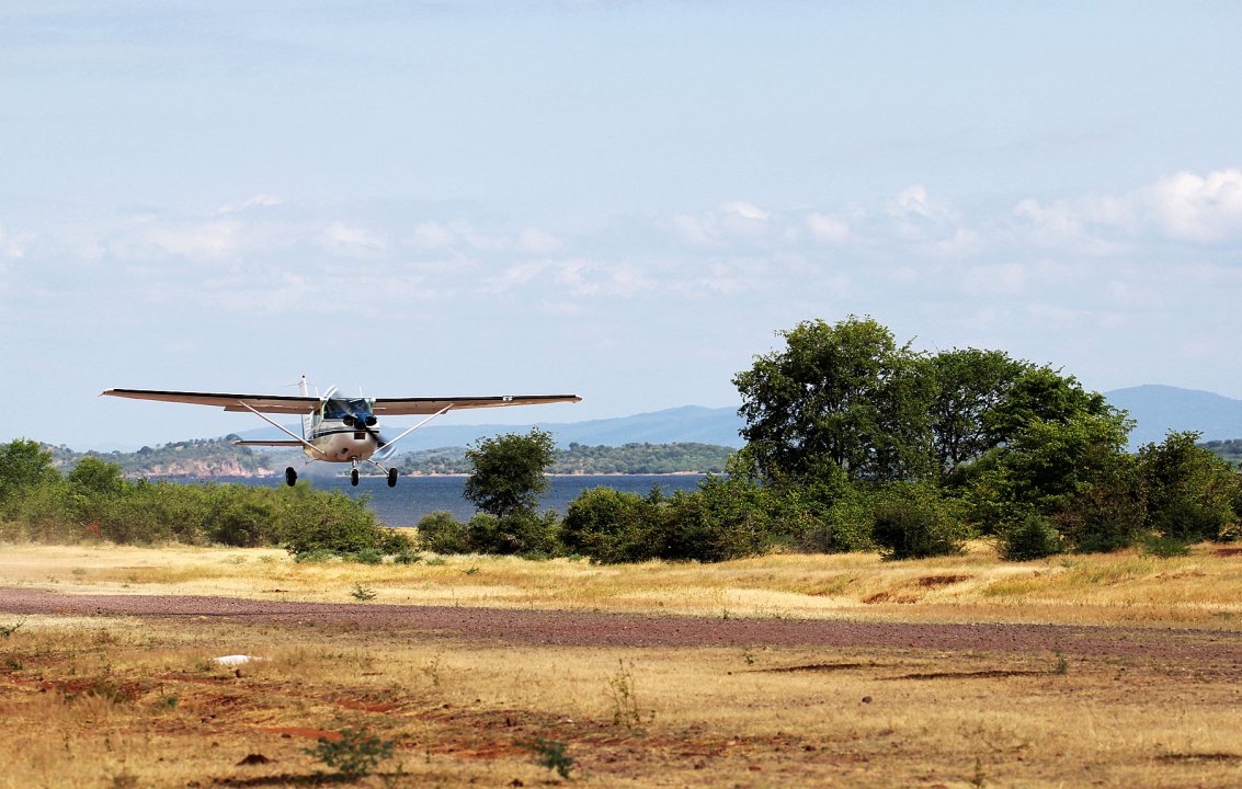 Nach Tete, kurz vor Songo, unserem ersten Zwischenstopp am Sambesi, hebt sich das Gelände um 900 Höhenmeter steil an, der Sambesi zwängt sich durch eine enge Schlucht. Wir folgen ihm solange wie möglich und drehen dann zum Airfield von Songo ab. Songo, das Versorgungsstädtchen für die Cahora Basse Talsperre, bietet eine komfortable geteerte Landebahn, jedoch leider kein Avgas. Der Pick up Service der Ugezi Tiger Lodge wartet bereits auf uns. Die Lodge liegt direkt am Stausee und wird vor allem von Fischern aus Südafrika besucht. Mehr als 50 verschiedene Spezies Fisch leben im Lake Cohara Bassa. Die Unterkunft ist spartanisch; die Lodge scheint dem Ansturm südafrikanischer Fischer nicht gewachsen zu sein und hat kurzerhand Übernachtungs-Container aufgestellt.