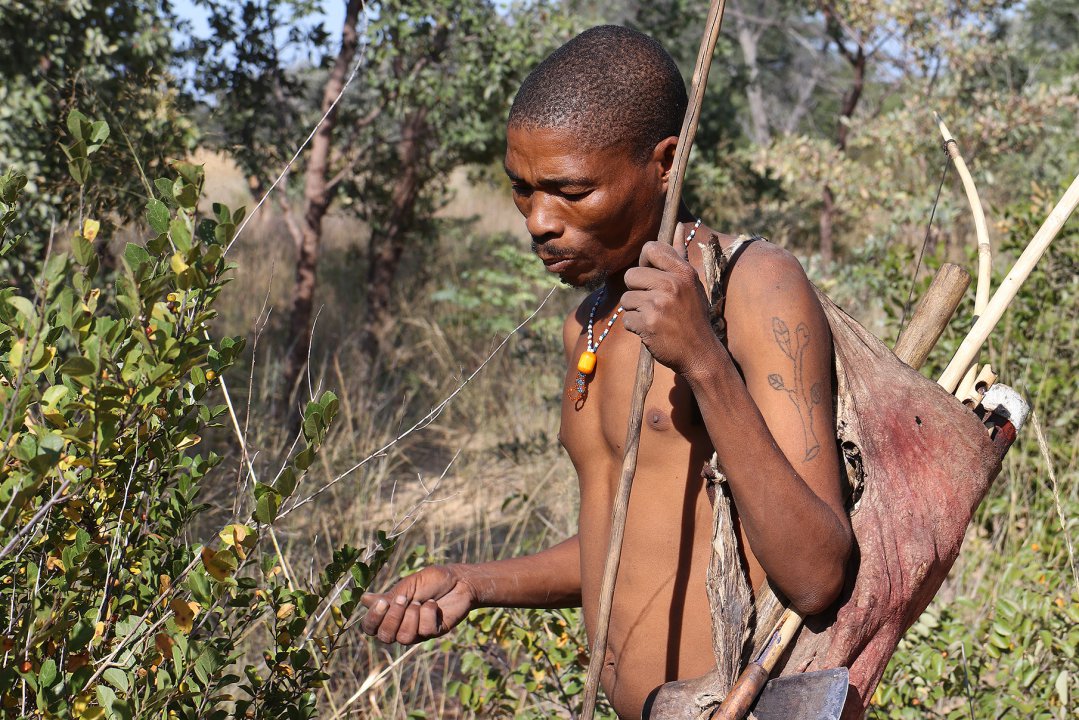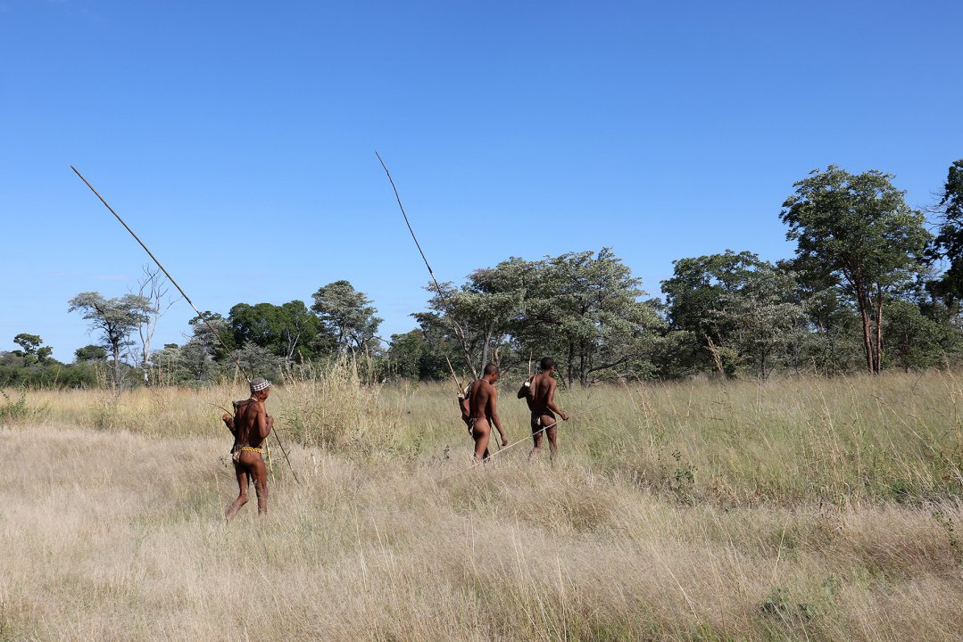 Am nächsten Morgen begleiten wir drei Ju/’hoan San Jäger auf die Jagd. Sie bewegen sich leichtfüßig in ihrer traditionellen Tracht durch das hohe Gras. Ihre bloßen Füße schützen Sandalen aus dickem Eland Leder vor dem heißen Sand und den spitzen Dornen. Wir versuchen in voller Montur mit ihnen Schritt zu halten.