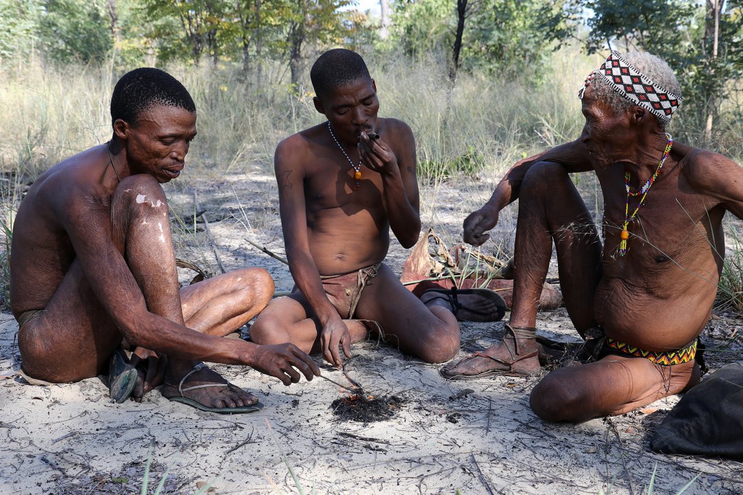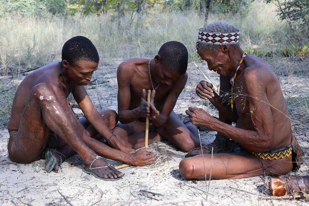 Unsere Begleiter zeigen uns essbare Pflanzen und Wurzeln. Für die Rauchpause entfachen sie auf traditionelle Weise ein Feuer.