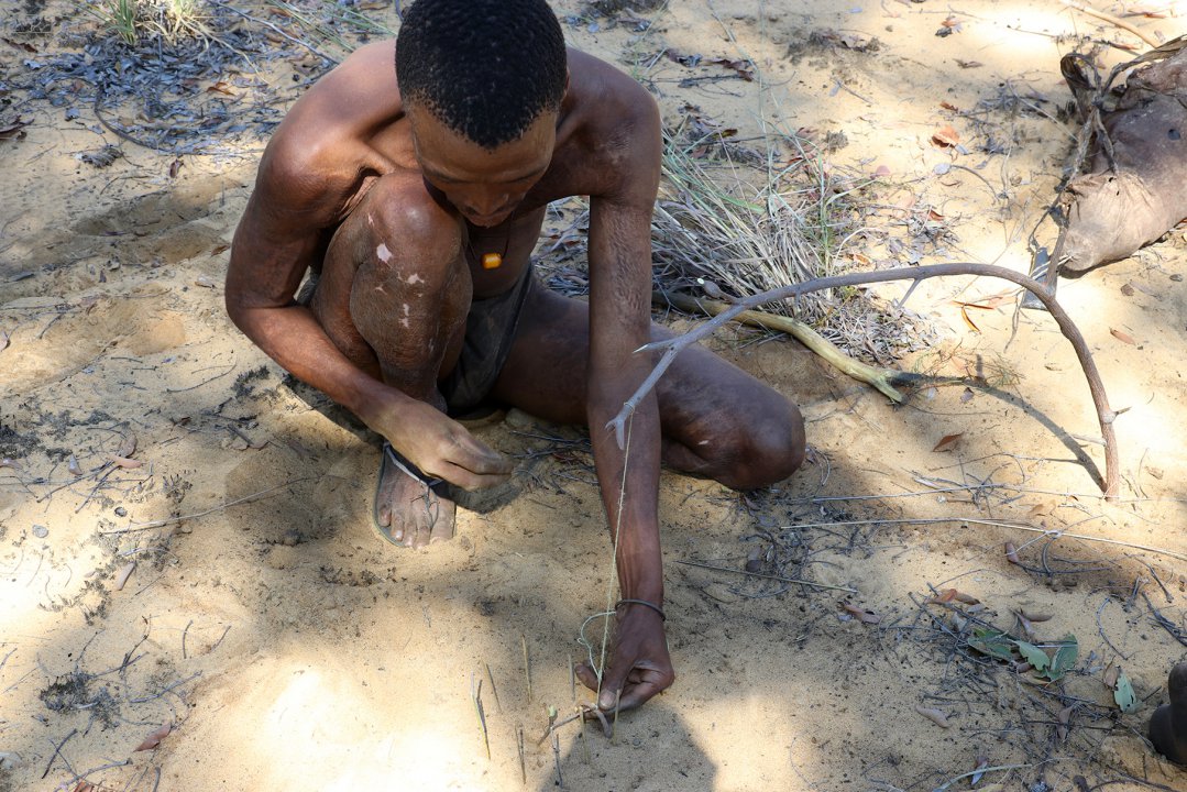 Von einer Akazie graben die Jäger möglichst gerade Stücke der Wurzeln aus. Die Wurzelstücke werden später im Feuer getrocknet. Das Mark schrumpft und lässt sich dann leicht heraus ziehen. Die resultierenden Röhren werden zu Köchern für ihre Pfeile verarbeitet.