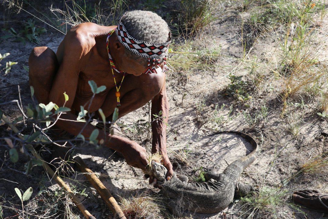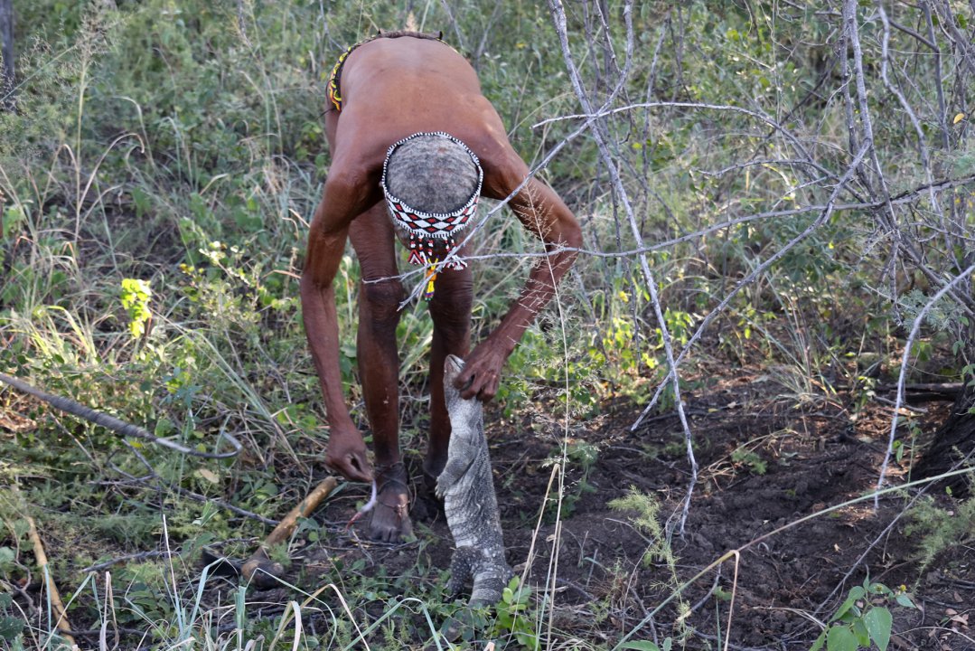 Ein Leguan beäugt uns noch nicht ganz wach aus einer Baumgabel. Geschickt holt ihn einer der Jäger mit einer Art Angel vom Baum. Durch heftigen Schlägen auf den Kopf wir er getötet. Mit einen Ruck reist ihm der Jäger die Zunge heraus und streicht in einem Ritual mit der Zunge mehrfach über den toten Körper. Das Tier wir verpackt und verschwindet zum Transport in einem der Ledersäcke.