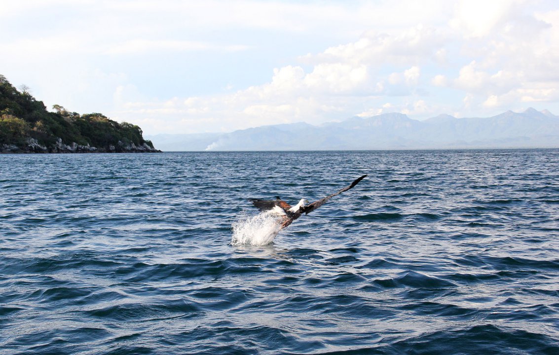 Mit einem kleinen Boot setzen wir zum Boadzulu Island über. In einer Bucht der kleinen Insel springen wir zum Schnorcheln in das klare Wasser des Sees und beobachten die zutraulichen, in allen Farben schillernden Barsche. Auf runden Granitfelsen im Wasser sitzend genießen wir ein paar kühle malawische Biere. Nachdem es uns allen gelungen ist wieder in das Boot zu klettern umrunden wir die Insel. Auf ihr sind etliche Fischadlerpärchen zu Hause die im Sturzflug Fische mit ihren Krallen packen und zu ihren Jungen bringen.