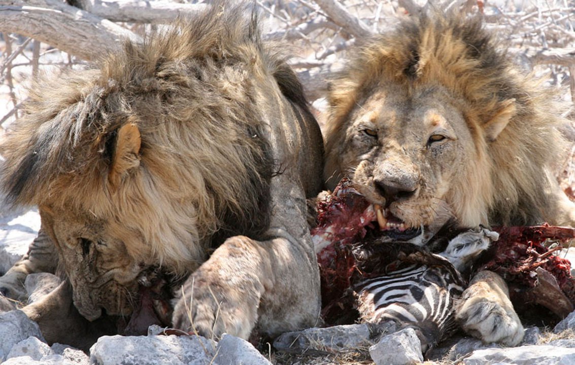 Zwei Kilomenter entfernt von Twee Rivieren im Kgalagadi Transforntier National Park (ehemals Kalarahari oder Gemsbok NP) gibt es eine gute asphaltierte Landebahn. Die Erlaubnis zum Einflug in den Park zu bekommen und dann auch noch einen Transfer vom Airfield zum Restcamp zu organisieren ist eine kleine Herausforderung. Wir versuchen mit dem Park Office Kontakt aufzunehmen und eine Einfluggenehmigung zu bekommen. Leider erfolglos. Der Vorschlag der Parkverwaltung ist, nach Upington zu fliegen, dort einen Mietwagen zu nehmen und die 400 km nach Twee Rivieren mit dem Auto zu fahren. Zur Durchführung unseres Vorhabens benötigen wir einheimische Unterstützung, die sich mit den Formalitäten und den Organisationsstrukturen in südafrikanischen Nationalparks auskennt. Auf unserem Stützpunkt bei Upington lernen wir eine nette Dame kennen, die sich zum Ziel gesetzt hat, uns die Einfluggenehmigung zu verschaffen und auch sicherzustellen, dass wir vom Airstrip abgeholt werden. Nach etlichen zähen Telefonaten gelingt es ihr, den richtigen Ansprechpartner für uns zu finden. Ranger Wilhelm und seine Mobilnummer sind der Schlüssel zum Erfolg. Wir dürfen einfliegen und man wird uns auch abholen. Bis zu letzt zweifeln wir daran, ob uns wirklich jemand am Airfield abholen wird. Doch ein Anruf kurz nach unserer Landung – das Mobilfunknetz funktioniert - und ein Park Ranger bringt uns wenig später mit seinem Pickup zum Rest Camp. Für die nächsten zwei Tage steht die C182 gut geschützt vor wilden Tieren auf dem eingezäunten Flugfeld von Twee Rivieren und wir dürfen den afrikanischen Busch genießen. Die Idee, die zwei Kilometer vom Airfield zum Camp zu Fuß zu gehen, sollte man verwerfen. Auf unserem Weg zum Camp treffen wir zwei Löwen, die gerade einen Gemsbok verzehren.